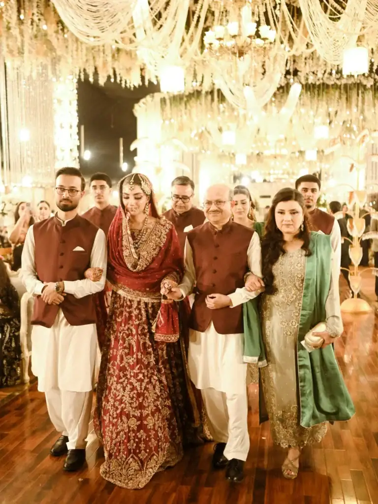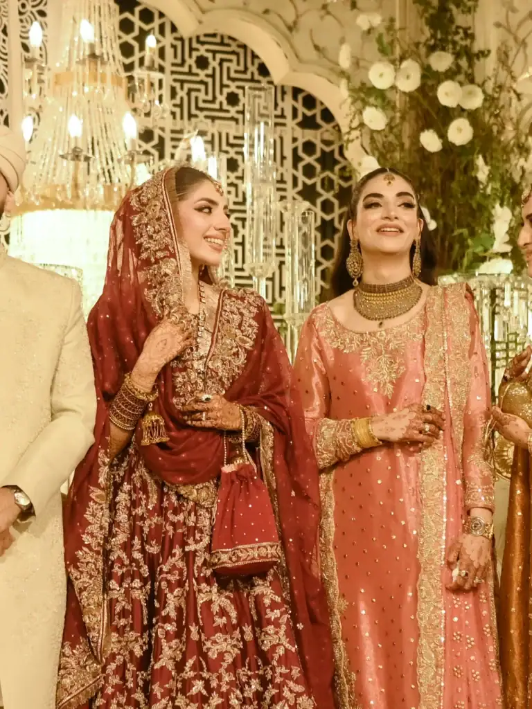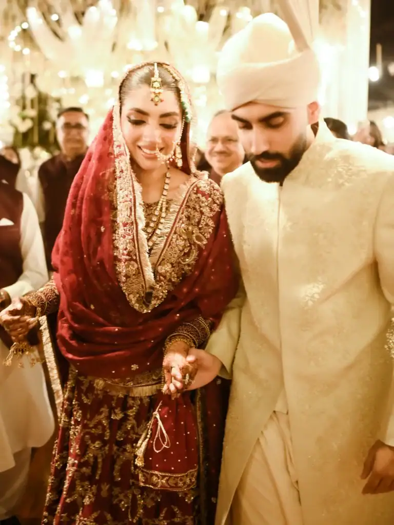 Annural Khalid looked absolutely stunning at her Barat as she chose a rich maroon-red lehenga, perfectly styled with glamorous makeup and traditional jewellery. Her radiant smile truly became her best accessory, adding an extra charm to her overall bridal look.