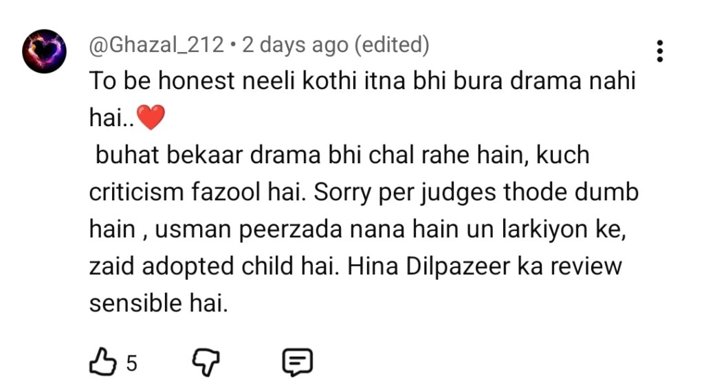 Drama viewers are strongly criticizing Nadia Khan and the judging panel for what they believe was unfair criticism of Neeli Kothi. Many viewers are also of the opinion that the judges appeared unprepared for the review.