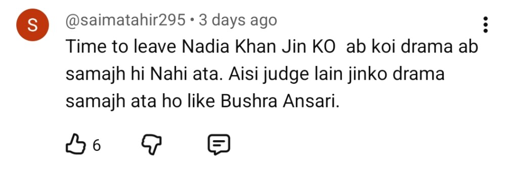 One viewer wrote, “It’s time for Nadia Khan to leave the show because she cannot understand any drama.” Another commented, “Please judges, watch the drama carefully—they already explained everything in the introduction.” A fan added, “We viewers are better than you. Each drama and each query is simple, clear, and understandable.”