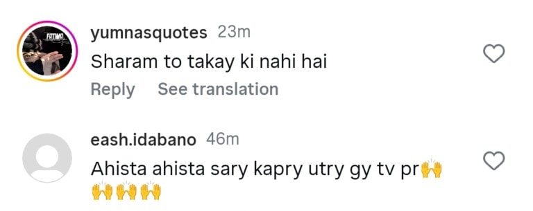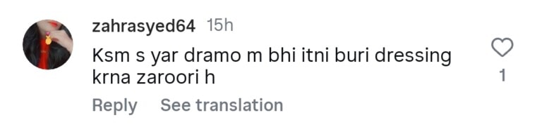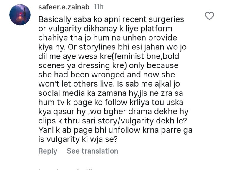 Social media users have been heavily criticizing Saba Qamar’s bold dressing. One fan wrote, “Basically, Saba needed a platform to showcase her surgeries and body, and HUM TV has given her that chance.” Another commented, “Now Pakistani dramas can’t be watched with family because of bold dressing and scenes.” One user added, “PEMRA is sleeping, and they are normalizing nudity.”